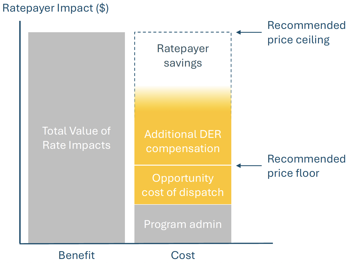 This valuation can be used to set a soft price ceiling for the total cost of Grid Services offerings to ensure net savings for customers. The compensation framework also recommends an effective price floor for incentives that is determined by the opportunity cost of dispatching DERs and will allow offerings to prompt dependable response from participants. An important recommendation of the study is that the state work to minimize this opportunity cost by aligning incentive signals across DER programs and rates.