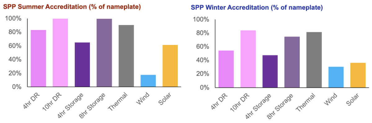 The study finds that, with current levels of adoption, in 2025 a four-hour program earns an ELCC of about 83% in summer and 55% in winter. A ten-hour program reaches about 100% in summer and 82% in winter, reflecting its ability to stay on through long winter events. In 2030, with SPP expected to add more variable resources and storage, the highest-risk periods in the winter can last eight, ten, or more hours, so four-hour accreditation declines while ten-hour holds its value.