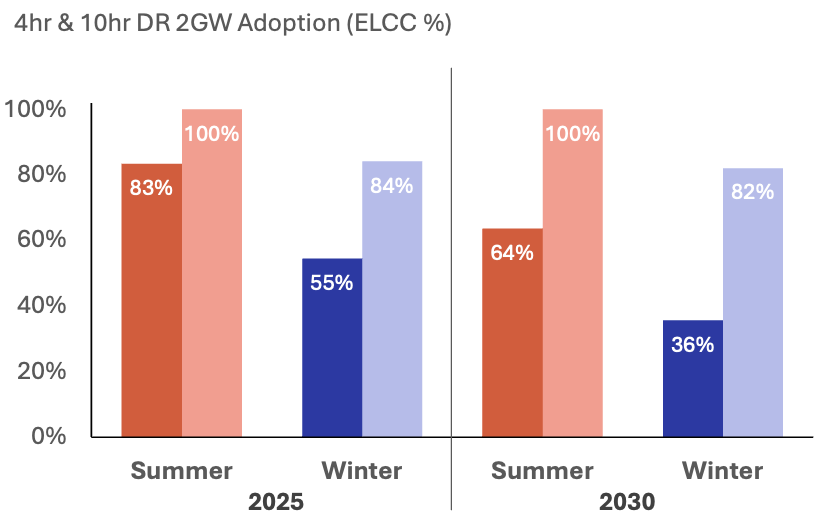 Scale brings familiar saturation effects for energy-limited resources. The first 2 GW of DR provide value that is aligned with system need, especially when each call can last ten hours. As DR adoption rises, the toughest hours stretch out and shorter-duration DR loses incremental capacity value through diminishing returns. In 2025, four-hour ELCC falls from about 83 percent at 2 GW to about 50 percent at 6 GW, while ten-hour declines by only about 11 percent over the same range.