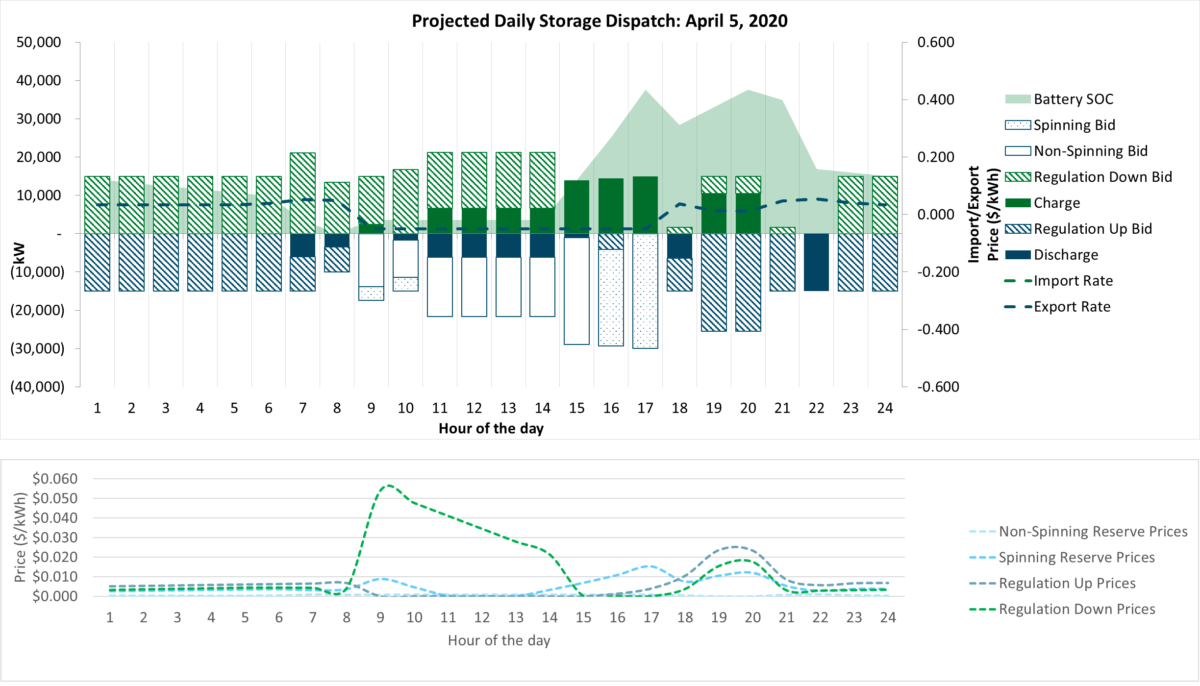The graph above presents the dispatch chart of a front-of-the-meter battery during the spring in California. The battery participates in the Day-Ahead SP15 CAISO market with a Resource Adequacy Call at hours 15 and 16. The battery provides regulation services in most of the hours due to the high regulation services price, and discharges to provide capacity for the system under the Resource Adequacy program hours.